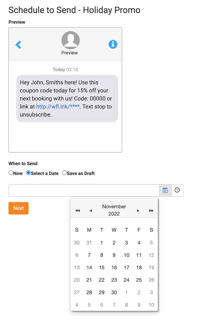 You can add links to your message as well. Just add the link text such as https://www.waiverfile.com. When you do, an orange button will appear, Shorten Links. Click on it and it will convert your links to use WaiverFile’s Short URL Service. The link will appear as https://wfl.ink/**** (the stars at the end will be your code). By using a short URL it will let you put longer links in your text messages without being so long that it pushes to additional messages.